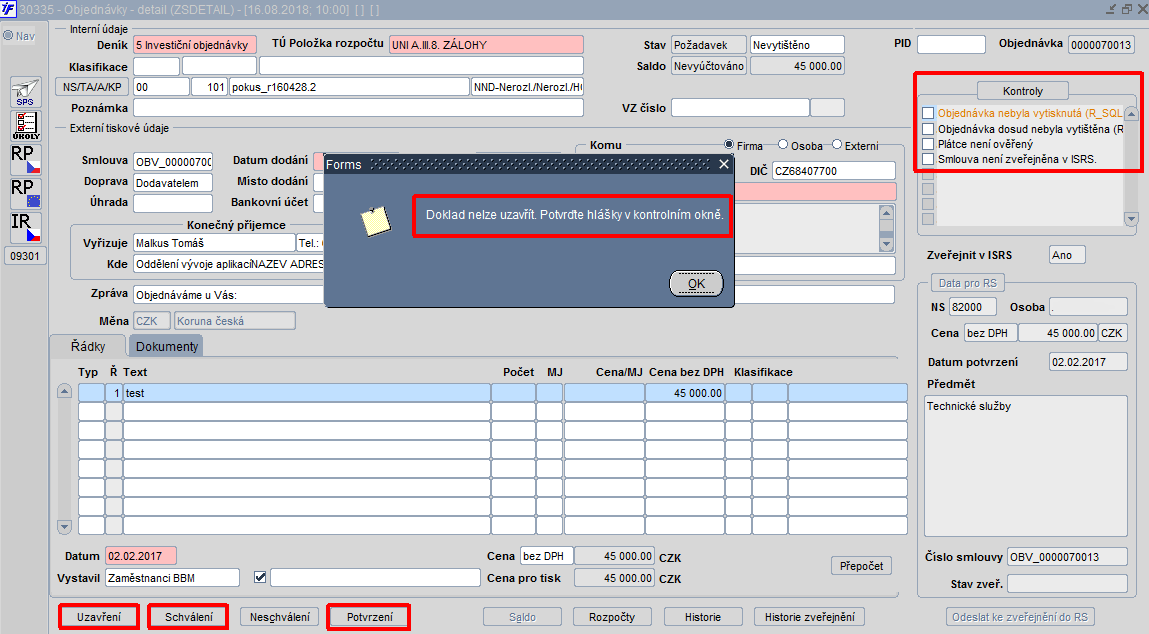- uzavření požadavku (navrhovatel objednávky tím předává požadavek ke schválení)