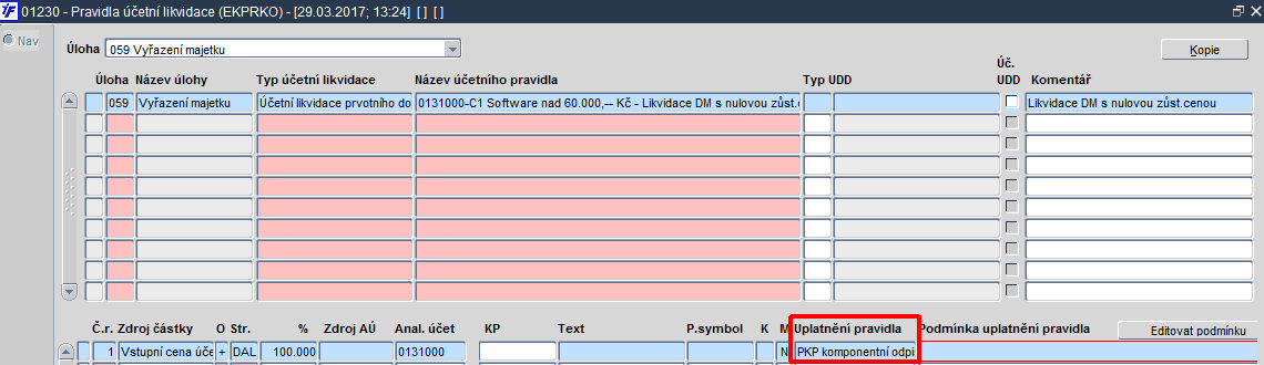 Obr. 01230/14 Položka "Uplatnění pravidla" s hodnotou "PKP komponentní odpisování"