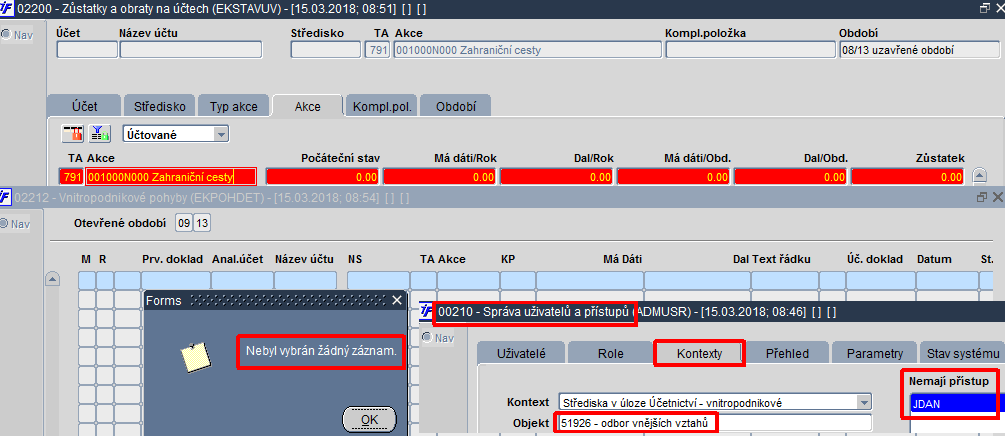 Pokud by účetní částky týkající se této zakázky byly zaúčtované také na jiná střediska, na která by měl uživatel JDAN přístup, nápočet částek ve formuláři 02200 - Zůstatky a obraty na účtech by se mu zobrazil dle těchto jemu přístupných středisek. Účtované částky zobrazované jednotlivým uživatelům se tak mohou lišit v závislosti na nastavení kontextových přístupů dle středisek.