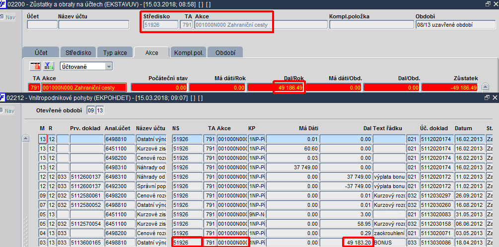 Příklad 1 Uživatel s kontextovým přístupem na středisko 51926 vidí ve formuláři 02200 - Zůstatky a obraty na účtech veškeré nápočty částek týkající se zakázky naúčtované na toto středisko ve výši 49.183,20 Kč. Stiskem klávesy pro Detail/Volání číselníku se uživateli zobrazí přehled účtovaných částek ve formuláři 02212 - Vnitropodnikové pohyby, v tomto případě pouze částka 49.183,20 Kč zaúčtovaná na jemu přístupné středisko. |