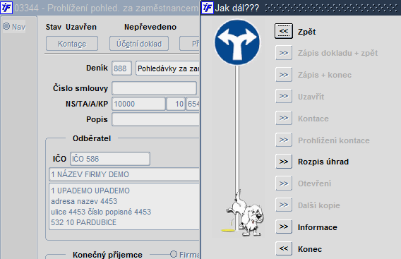 Funkce umožňuje pouze prohlížení pohledávky za zaměstnancem, prohlížení účetní likvidace pohledávky, příslušných úhrad a záloh. Na tyto volby lze získat přístup buď přímo z formuláře, nebo z nabídky, která se objeví po stisku klávesy Konec. Formulář lze vyvolat například z funkce 03343 - Prohlížení pohledávek za zaměstnanci.