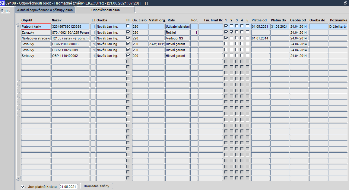 Obr. Odpovědnosti osob - Hromadné změny – záložka "Aktuální odpovědnosti a přístupy osob
