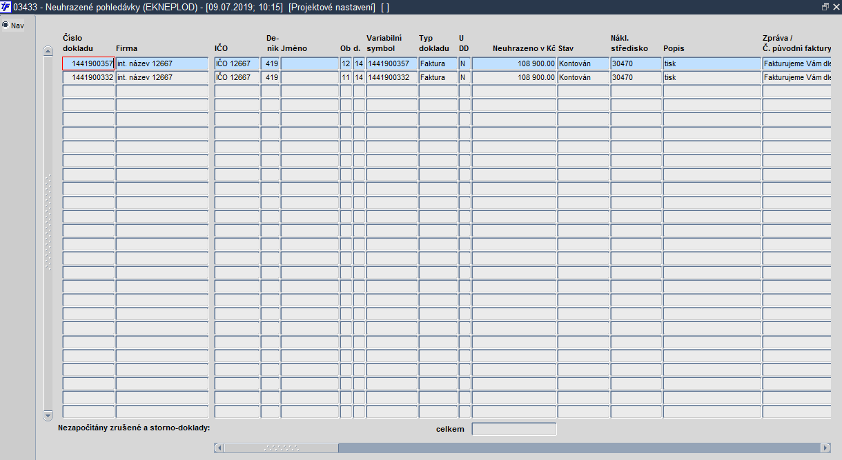 - Neuhrazeno v Kč – určuje hodnotu neuhrazené pohledávky