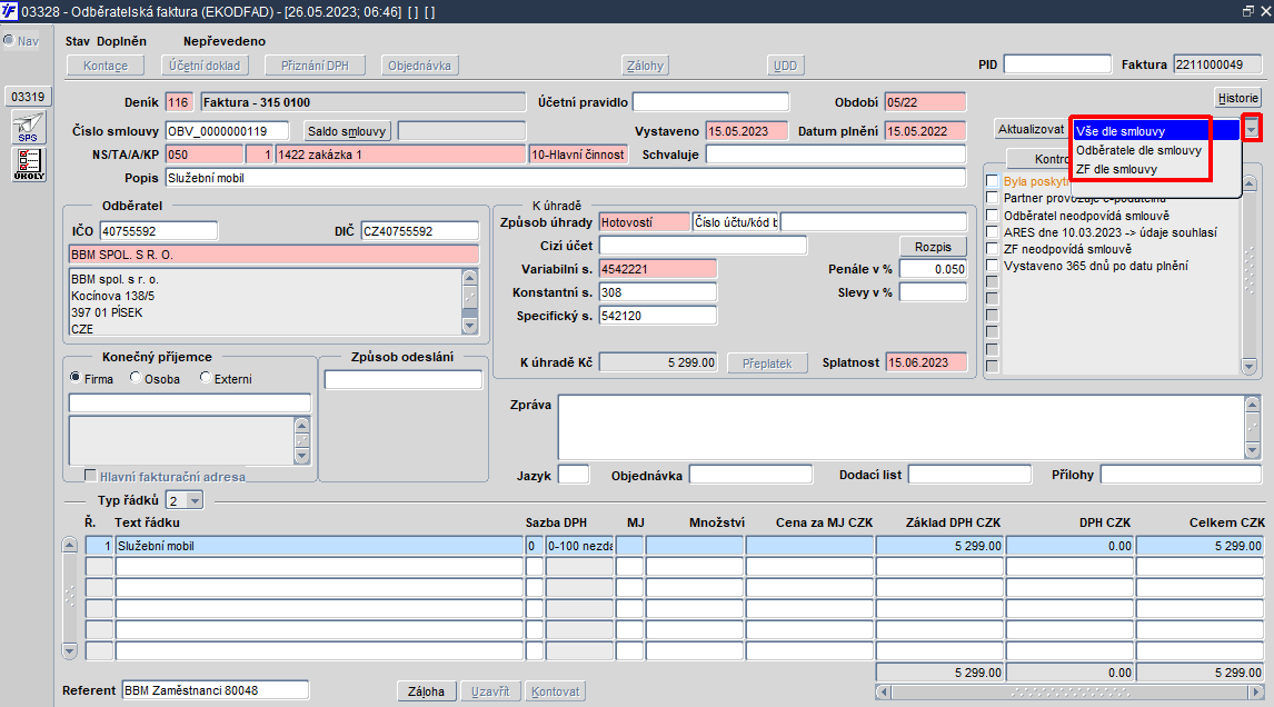 Obr. Roletka "Aktualizovat" ve formuláři 03328 - Odběratelská faktura
