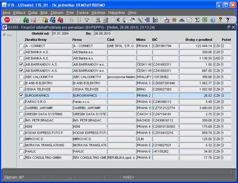 Jsou zobrazeny firmy, které lze penalizovat za období zadané ve funkci 03354 - Období pro penalizaci. Spolu s názvy firem vidíme i počet dokladů, které lze dané firmě za dané období penalizovat. Seznam firem můžeme zúžit dotazem. Jednotlivé řádky, u kterých potřebujeme, aby vstoupily do penalizace, musíme ještě označit zaškrtávátkem, které je na začátku řádky. Z takto případně zúženého seznamu se po stisku klávesy Konec zobrazí detailní seznam jednotlivých pohledávek tvořící předešlý souhrnný seznam. Řádky detailního seznamu jsou také uvozeny zaškrtávátkem, pomocí kterého můžeme ještě některé pohledávky vyloučit z penalizace. Po dalším stisknutí klávesy Konec se přesuneme do dalšího formuláře (03356), kde se po výběru vhodného deníku již vytvoří nové penalizační faktury v měně deníku bez ohledu na to, jakých měn jsou penalizované pohledávky. Pro případný přepočet do měny deníku se použijí kurzy z data zadaného při vstupu do penalizace ve formuláři 03354. Pokud existuje právě jeden deník pro penalizační faktury, doklady se do něho zařadí samy bez nutnosti výběru deníku. Poté je zobrazen seznam vzniklých penalizačních faktur. Ty můžeme dále jednotlivě upravovat.