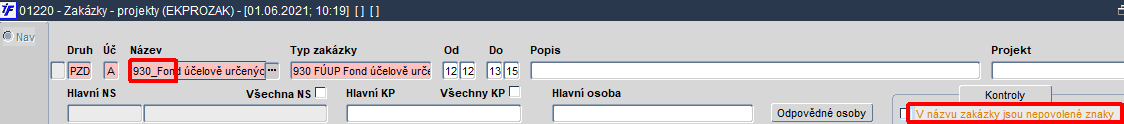 - "V názvu zakázky jsou nepovolené znaky" - kontroluje nepodporované znaky v názvu zakázky, objeví se, pokud je v názvu zakázky uveden alespoň jeden z těchto nepodporovaných znaků: