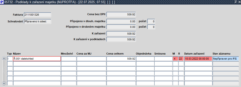 Obr. 05732/1 Vyvolání formuláře s podklady k zařazení majetku