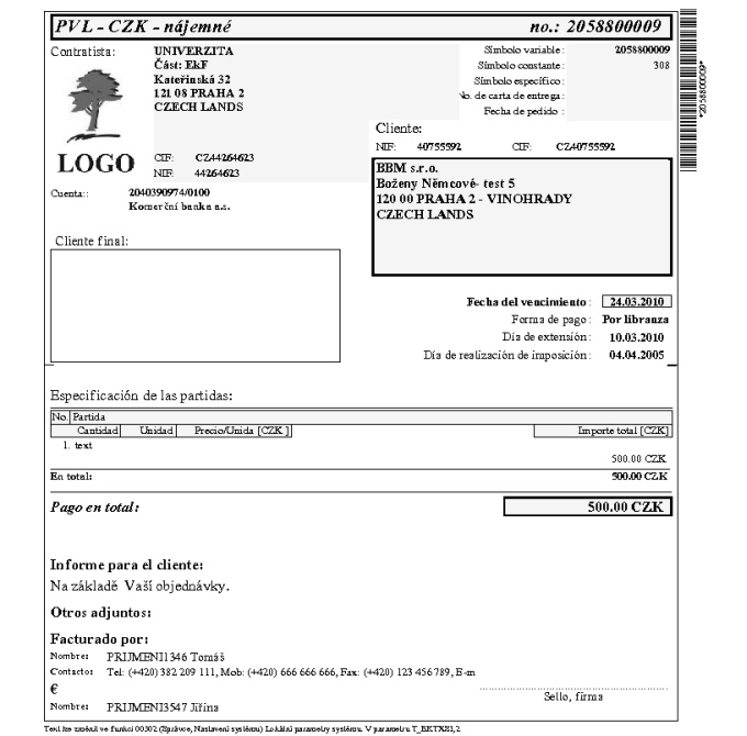 | T_EKTXS1 | Text 1 který se vypíše na konci španělské faktury (mimo rámeček). | 00302 - Lokální parametry |