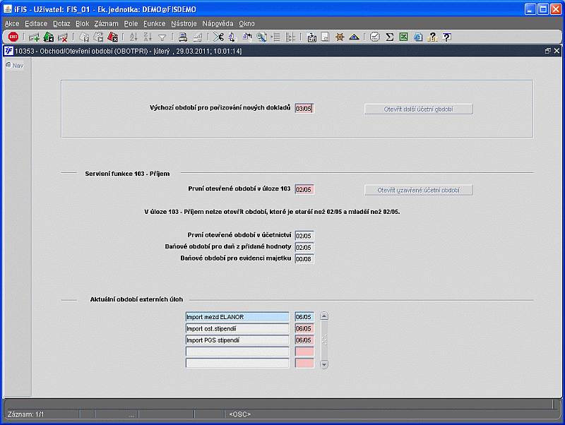 Formulář slouží k otevření druhého účetního období pro úlohu 103 - Příjem. Je-li dosaženo maximálního počtu povolených období pro systém v roce (globální parametr OBDOBI, typicky 12), je otevřen první měsíc roku následujícího.
