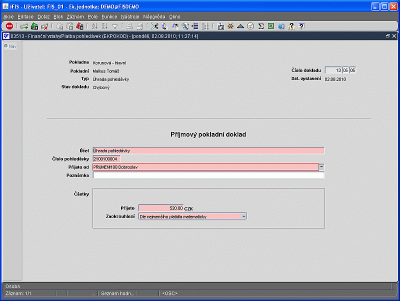 Po proplacení celé zbývající částky se závazek stává saldokontně vyrovnaným. Po uzavření dokladu nelze již údaje měnit. V pokladním dokladu musí být vyplněny všechny položky kromě položky Poznámka.