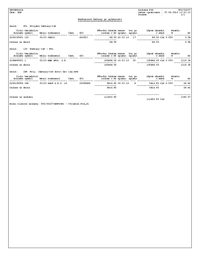 Neuhrazené závazky po splatnosti setříděné podle deníků, součty za deník.