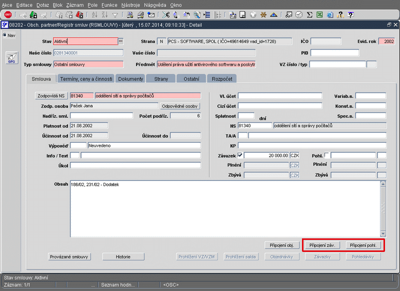 - tlačítko "Zodpovídá NS" - nestačí-li údaj o jednom zodpovědném středisku, použije se tlačítko na připojení dalších středisek ke smlouvě, kontextový přístup je pak funkční i na takto připojená střediska