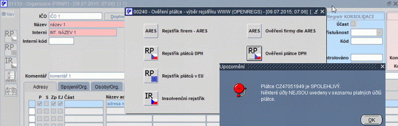Obr. 00240/2 Kontrola Registru ARES v číselníku organizací