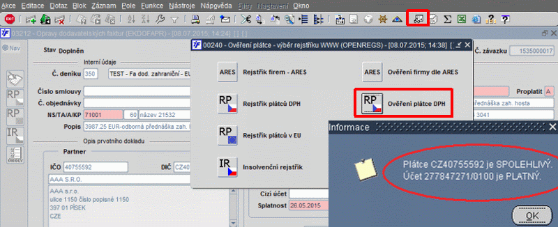"Ověření plátce DPH" lze rovnou provést ověření plátce DPH a jeho spolehlivosti - zároveň je ověřována i platnost čísla bankovního účtu uvedeného plátcem DPH