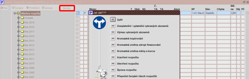 Obr. 02430/2 Rozpočty a plány - tlačítko "Servis" - přehled funkcí