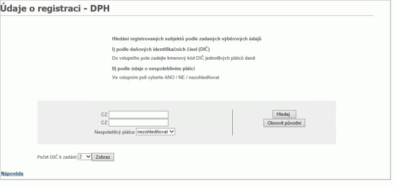 - Rejstřík plátců DPH z blokového schéma se otevře Rejstřík plátců DPH, kde je možné získat aktuální údaje o plátci DPH