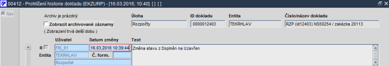 Každá změna v hlavičce rozpočtu se zaznamenává do historie. Historie změn k hlavičce rozpočtu (založení, uzavření, otevření) - kurzor je uvnitř daného rozpočtu a použije se ikona pro Volání číselníku.