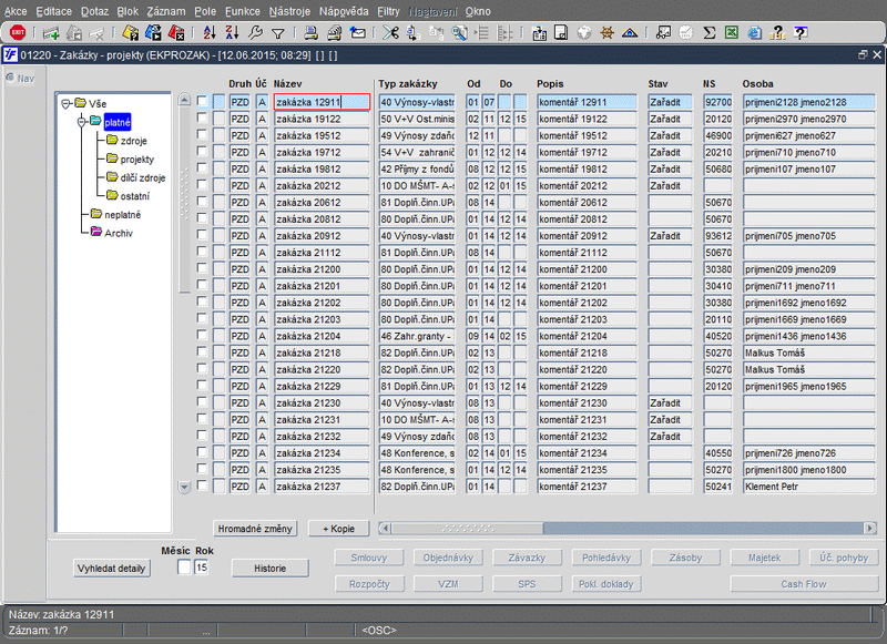 - levá část - zde je adresářová stromová struktura, která slouží pro rychlejší výběr a snazší orientaci v zakázkách-projektech (aktuální pozice kurzoru v adresáři určuje typ zobrazených zakázek-projektů)