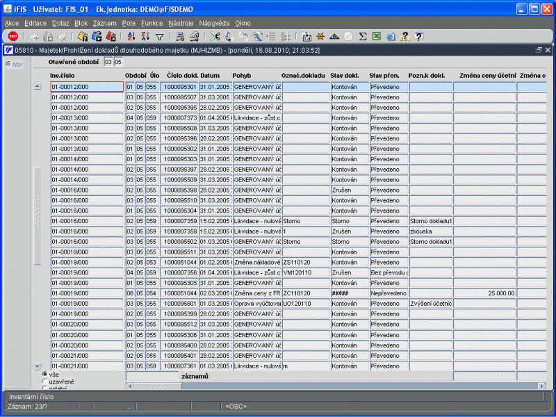 V přehledu dokladů jsou zobrazeny všechny doklady o operacích s dlouhodobým majetkem. Stiskem klávesy Výběr se zobrazí detailní informace o vybraném dokladu.
