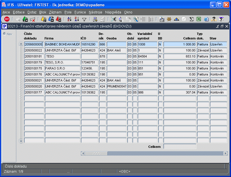 V jednom přehledu vidíme pohromadě uzavřené nebo kontované závazky - faktury, dobropisy, zálohové listy, jednotné celní deklarace. Tlačítkem Výběr zobrazíme jednotlivý doklad a můžeme v něm změnit některé textové údaje a rovněž i položky zdroje financování (bez promítnutí do účetní likvidace v případě, že již účetní likvidace existuje). Jestliže je doklad kontován, ale nepřeveden do účetnictví, a opravuje se koeficient nároku na odpočet, tak systém napíše upozornění a doklad převede do stavu "Uzavřen".