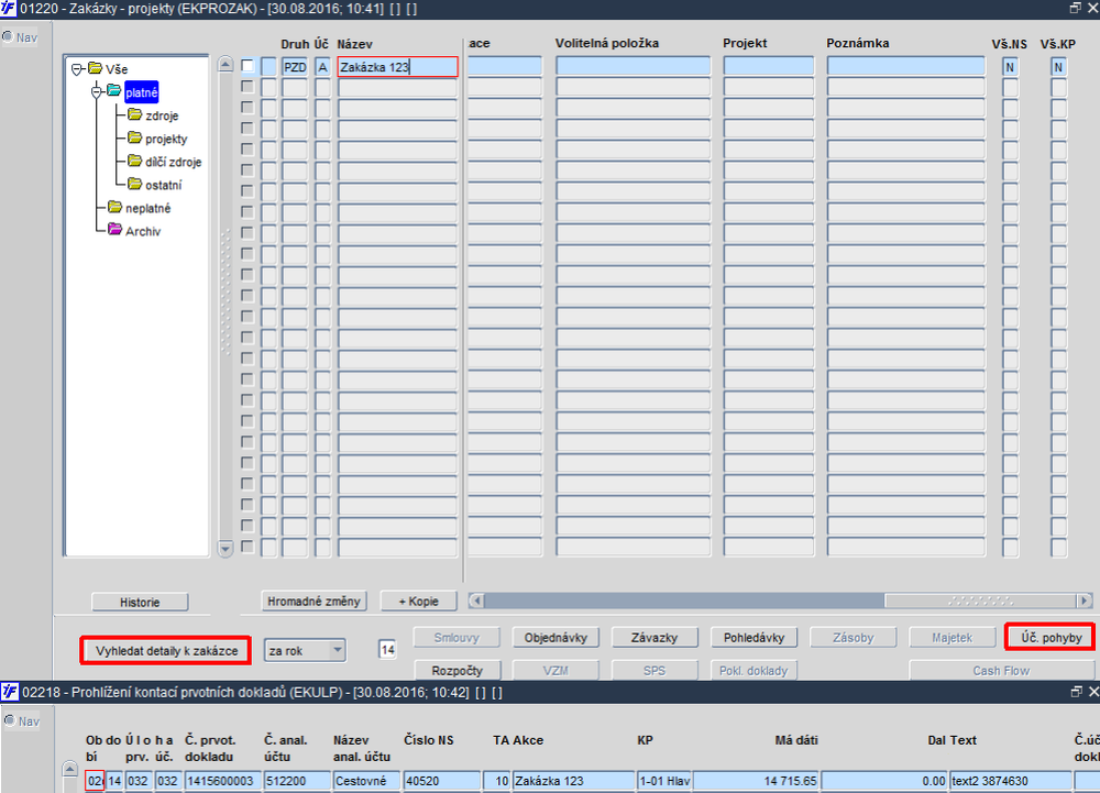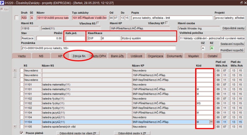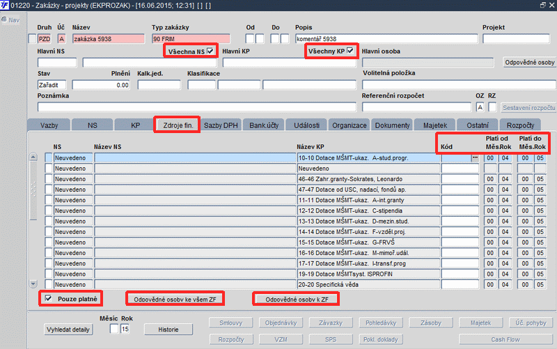 - zdroje - zobrazí všechny zakázky-projekty s druhem zakázky = ZDR (Zdroj financování)