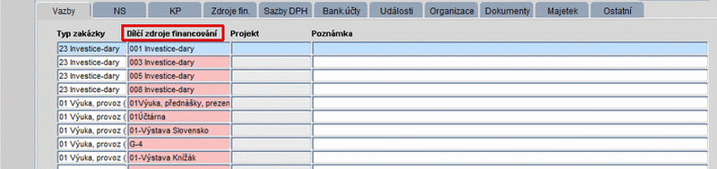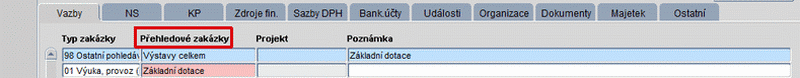 Záložka Vazby je určena pro evidenci tzv. podřízených dílčích zakázek k přehledové zakázce. Přehledová zakázka je zakázkou typu ZDR nebo AKT. Tyto přehledové zakázky slouží především pro sledování více-zdrojového financování projektu. Do přehledů obratů a zůstatků přehledových zakázek ZDR a AKT se budou načítat obraty a zůstatky zde přiřazených dalších zakázek PZD.