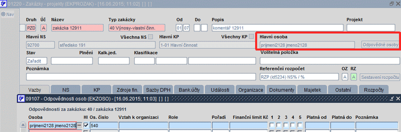 V položce Hlavní osoba je definována hlavní osoba zodpovědná za danou zakázku. Stiskem tlačítka "Odpovědné osoby" (