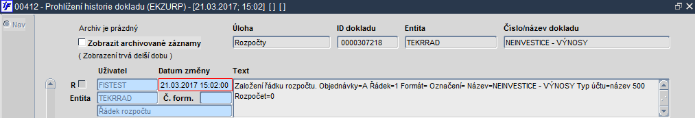 Každá změna v hlavičce rozpočtu se zaznamenává do historie. Historie změn k hlavičce rozpočtu (založení, uzavření, otevření) - kurzor je uvnitř daného rozpočtu a použije se ikona pro Volání číselníku.