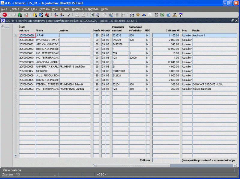 V úvodním přehledu vidíme seznam všech generovaných pohledávek vzniklých uhrazením přijatého zálohového listu. Doklad, který chceme upravit, zobrazíme stiskem klávesy Výběr, čímž dojde ke spuštění funkce 03278 - Oprava pohledávky z poskytnuté zálohy, v níž lze měnit hodnoty některých položek generované pohledávky.