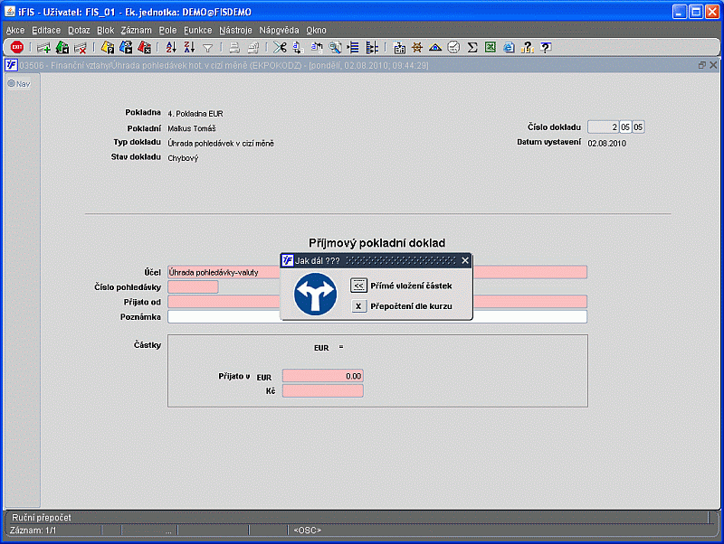 Podle měny vybrané pohledávky se modifikuje vzhled obrazovky pro vytvoření pokladního dokladu. Jsou tři možnosti: