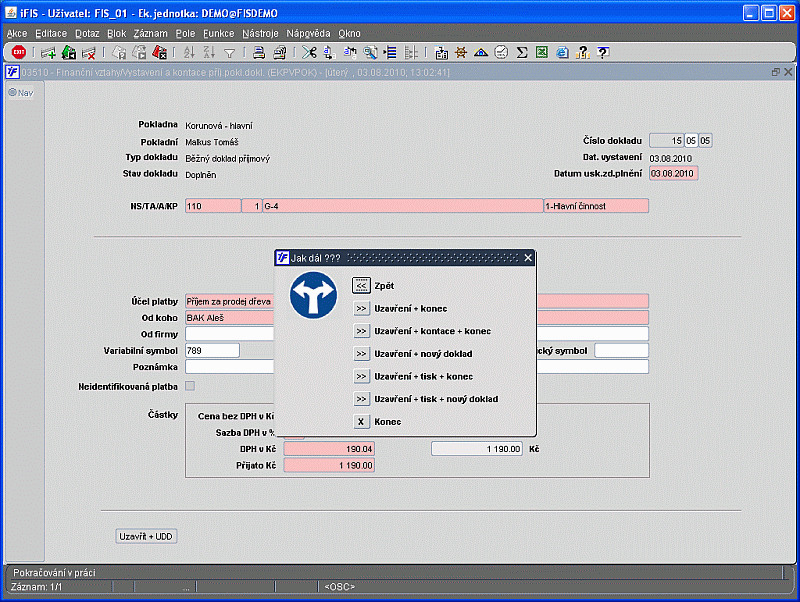 Obr.03510/2 Vystavení a kontace příjmového pokladního dokladu - uzavření