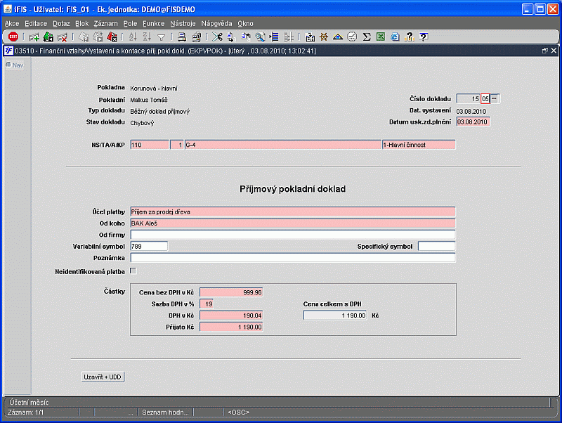 03510 * Vystavení a kontace příjmového pokladního dokladu