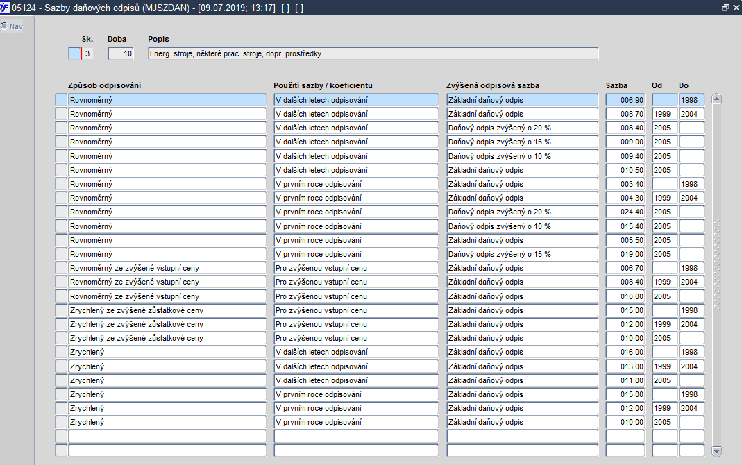 - Použití sazby - určení sazby v závislosti na roku odepisování