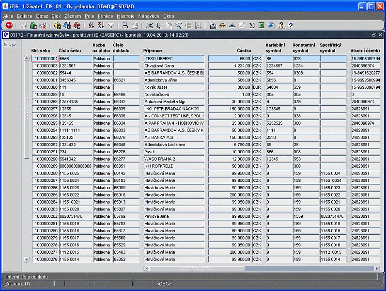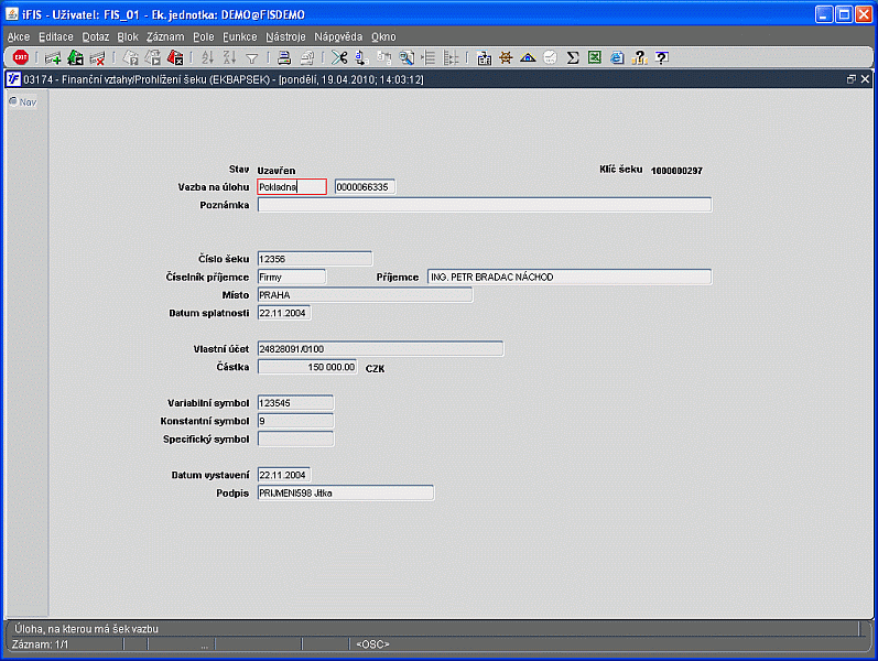 Tato funkce slouží jak pro prohlížení vystavených šeků, tak i pro opravy či pořízení vystavených šeků. Pokud je doklad ve stavu Chybový nebo Doplněn, je možno klávesou pro výběr spustit formulář 03173 - Oprava šeku a zde příslušný šek opravit. Pokud je však doklad ve stavu Uzavřen, je možné si ho pouze prohlížet a to ve formuláři 03174 - Prohlížení šeku. Stiskem klávesy pro Nový záznam se spustí formulář 03171 - Vystavení šeku, kde je možno zapsat nový šek.