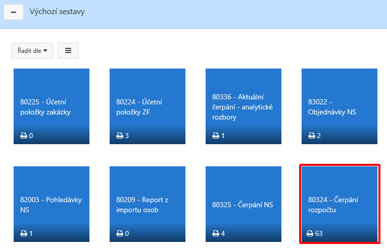Dlaždice výchozí sestavy obsahuje číslo a název sestavy. Vlevo dole je ikona, která informuje o počtu vygenerování dané sestavy. Další vlastnosti dlaždice jsou přístupné až u sestavy uložené uživatelem.