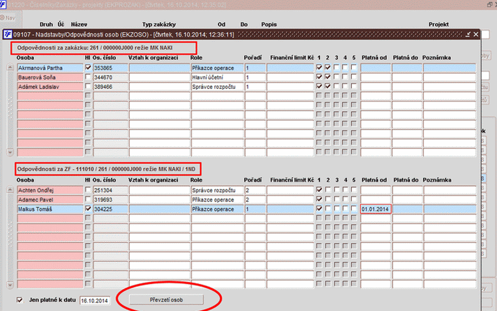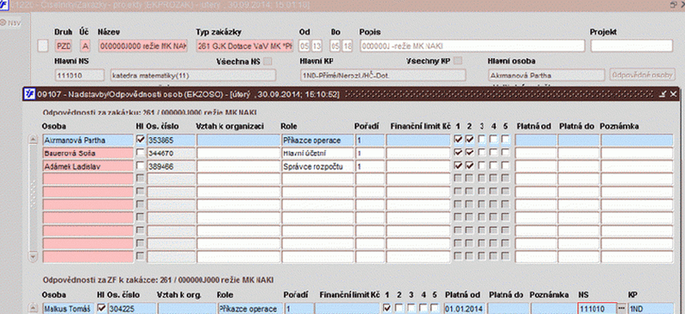 | Osoby u ZF zakázky | Doplnění | Zodpovědná osoba (povinná položka) Hl (Jde o hlavní osobu) Role Pořadí 1, 2, 3, 4, 5 (zatržítka, 1 - přístup na Webmailer) Platí od Platí do Fin. limit Poznámka |