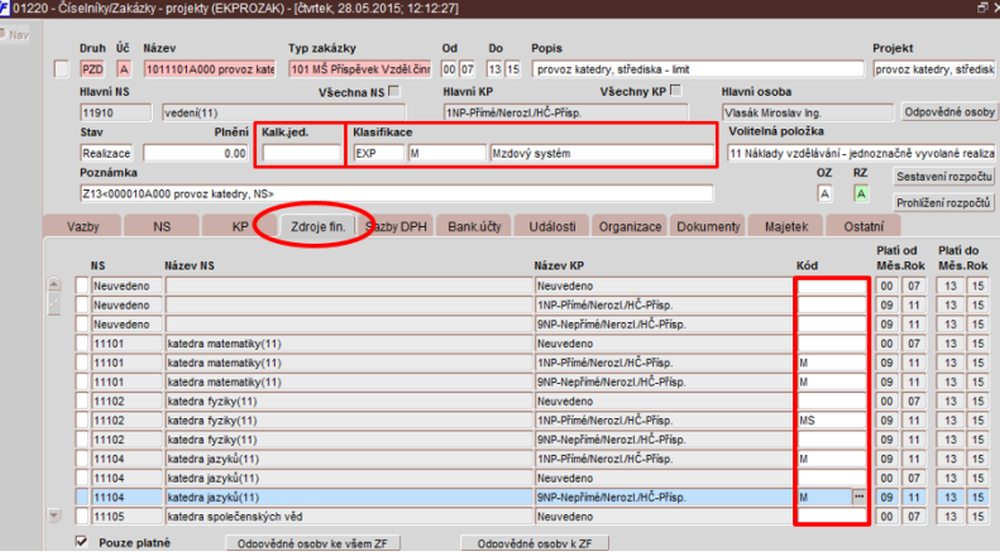 Obr. 01220/15 Odpovědné osoby k zakázce (horní blok) a ke všem zdrojům financování (dolní blok)