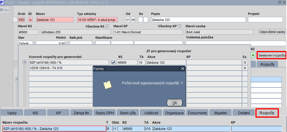 Na záložce Rozpočty se zobrazují pouze rozpočty s vazbou na aktuální zakázku. Rozpočty nadřízených ZF se nezobrazují.