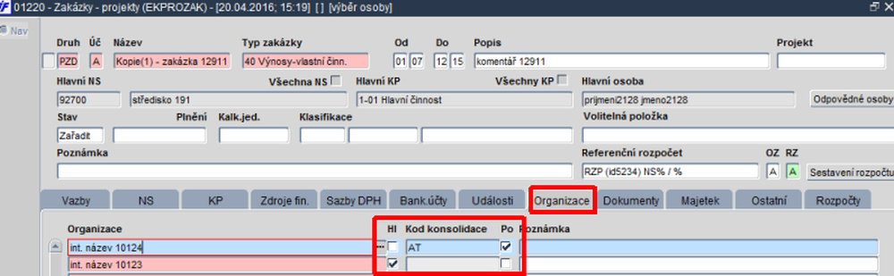 Obr. 01220/19 Záložka "Organizace" ve formuláři 01220 – Zakázky – projekty