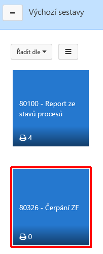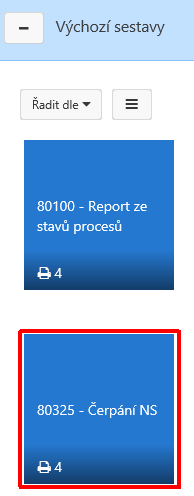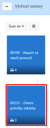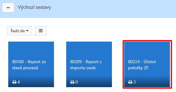 Dlaždice výchozí sestavy obsahuje číslo a název sestavy. Vlevo dole je ikona, která informuje o počtu vygenerování dané sestavy. Další vlastnosti dlaždice jsou přístupné až u sestavy uložené uživatelem.