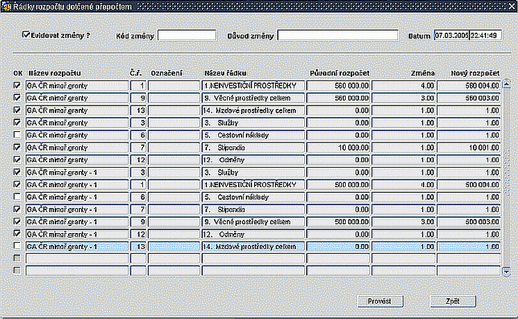 Přepočty se řídí i nastavením v řádcích. Označení v položce Fix zabrání změně částky řádku při přepočtu. Při použití přepočtu "Přepočet aktuálního a nadřízených rozpočtů" se otevře tabulka s názvy nadřízených rozpočtů, čísly řádků, označeními rozpočtovaných položek, názvy řádků, původními rozpočty, změnami a novými rozpočty. Každý řádek lze označit/odznačit a tím se udává, který řádek a nadřízený rozpočet se budou přepočítávat. Při uzavřeném rozpočtu se zaznamenají částky do položky Rozpočet pův.
