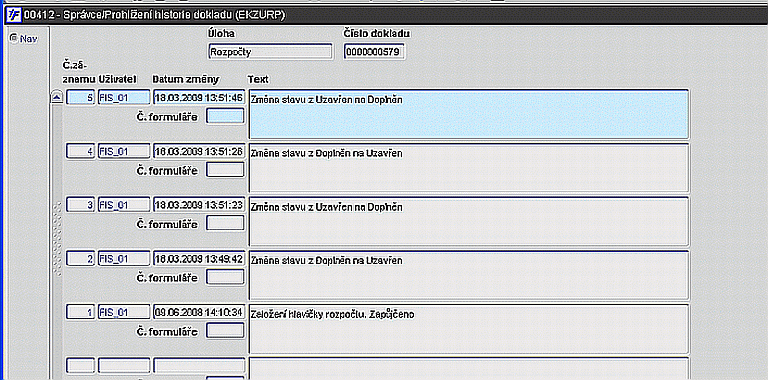 Každá změna v hlavičce rozpočtu se zaznamenává do historie. Historie změn k hlavičce rozpočtu (založení, uzavření, otevření) - kurzor je uvnitř daného rozpočtu a použije se ikona pro vyvolání číselníku nebo CTRL+A