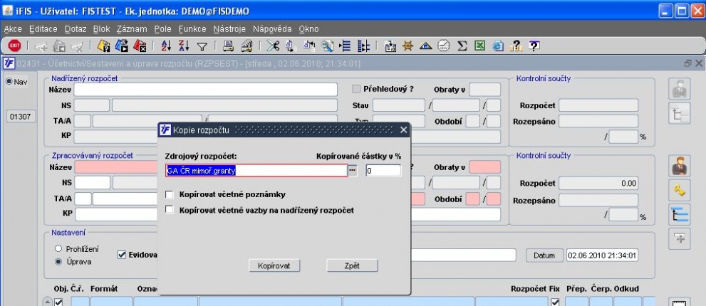 Pokud se uživatel rozhodne vytvořit nový rozpočet kopírováním jiného rozpočtu, pak je vyzván k označení tzv. zdrojového rozpočtu. Po stisku klávesy Výběr se data zdrojového rozpočtu překopírují do nového rozpočtu.