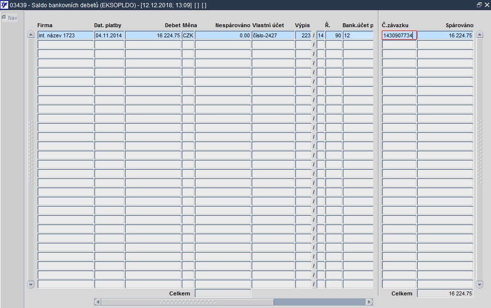 Formulář slouží pouze k prohlížení řádků bankovních výpisů. V levé části obrazovky jsou nabízeny řádky bankovních výpisů mající částku na straně Debet. Tyto řádky musí být spárovány s nějakým závazkem. Jejich položky se nevejdou do příslušné části obrazovky, proto levá polovina obrazovky roluje po těchto položkách pomocí klávesy pro Předchozí pole. V pravé části obrazovky se objeví závazek, se kterým je řádek z levé části obrazovky spárován, až po stisku klávesy pro Další blok. Detail prvotních dokladů lze prohlížet klávesou Výběr.