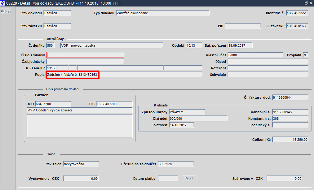 Formulář slouží k úhradě závazků. Formulář lze vyvolat z položky Identifik. číslo umístěné ve formuláři 03210 – Rozpis úhrad klávesou pro Detail/Volání číselníku.