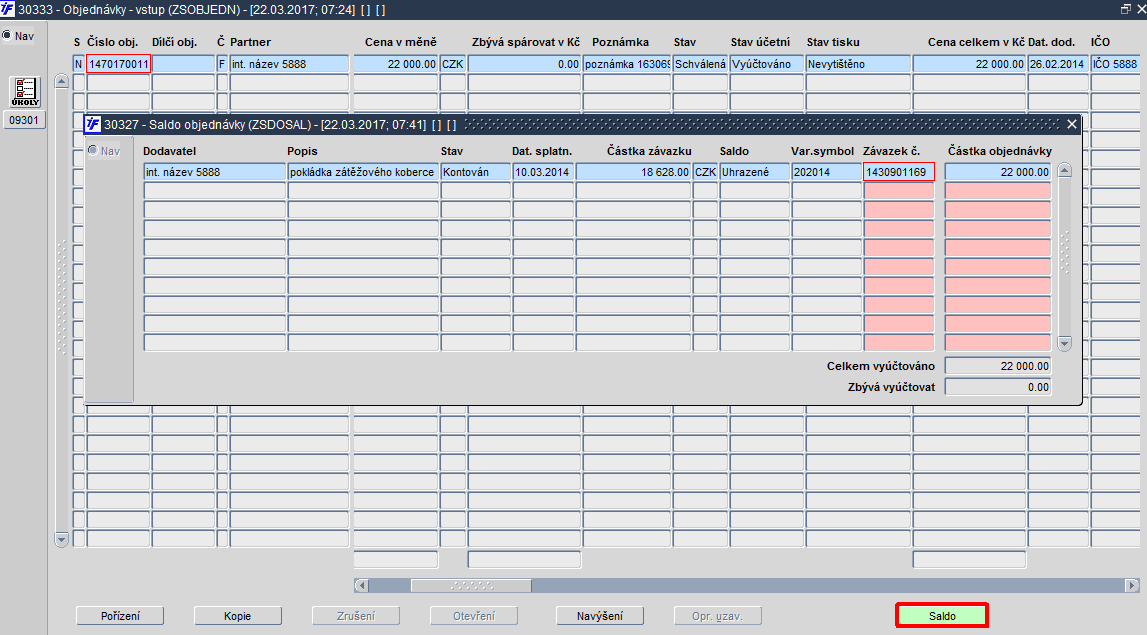 Obr. 30333/5 Prohlížení salda objednávky se závazkem tlačítkem "Saldo"