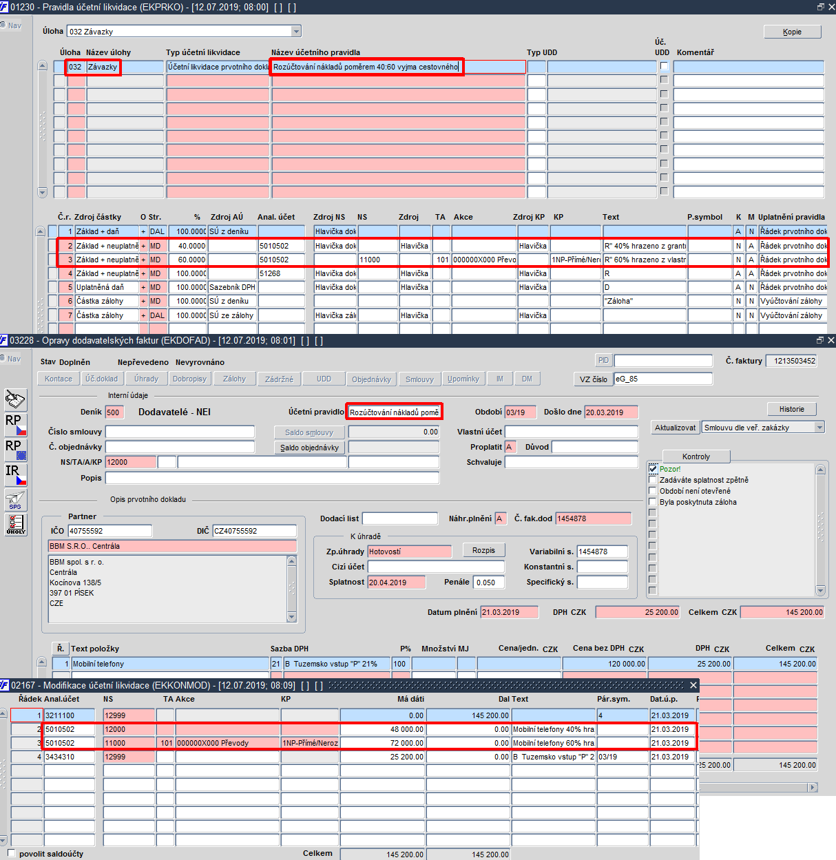 Příklad rozúčtování dle vybraného účetního pravidla nastaveného ve formuláři 01230 - Pravidla účetní likvidace pro úlohu 032 - Závazky: