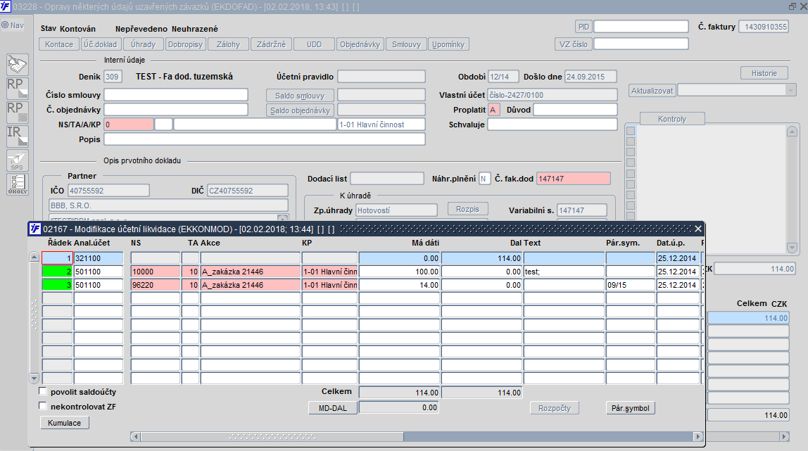 Obr. 02167/2 Modifikace účetní likvidace - uložení platné účetní likvidace