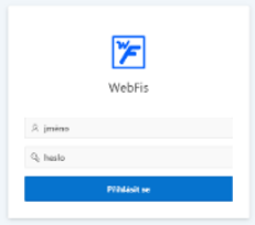 Přihlášení do webové aplikace WebFIS je možné provést na příslušné webové stránce dané organizace, kde je webová aplikace spuštěna. Do webové aplikace je možné se přihlásit pomocí uživatelského jména a hesla. Do pole s ikonou