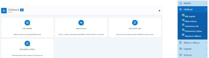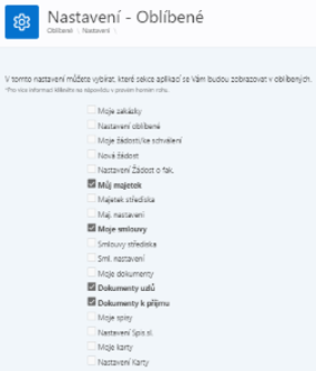 Každý modul je možné zařadit do oblíbených. Do těchto položek je možné snadněji a rychleji přistupovat přes speciální část v postranním menu. Tato funkcionalita je vhodná pro moduly, které uživatel nejčastěji navštěvuje.